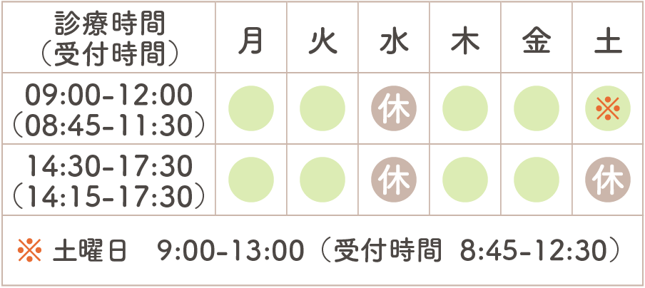 - 診療状況により受付時間より早く受付を終了させていただく場合がありますので、お時間に余裕を持っておいでください。
