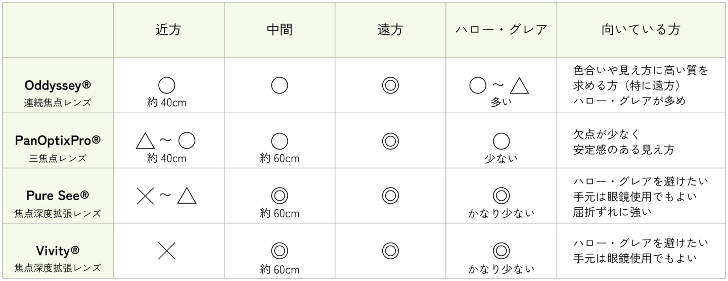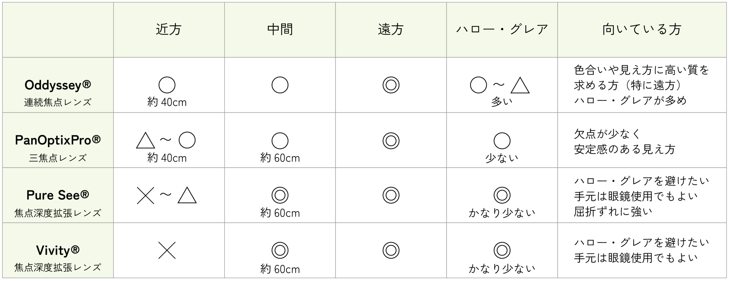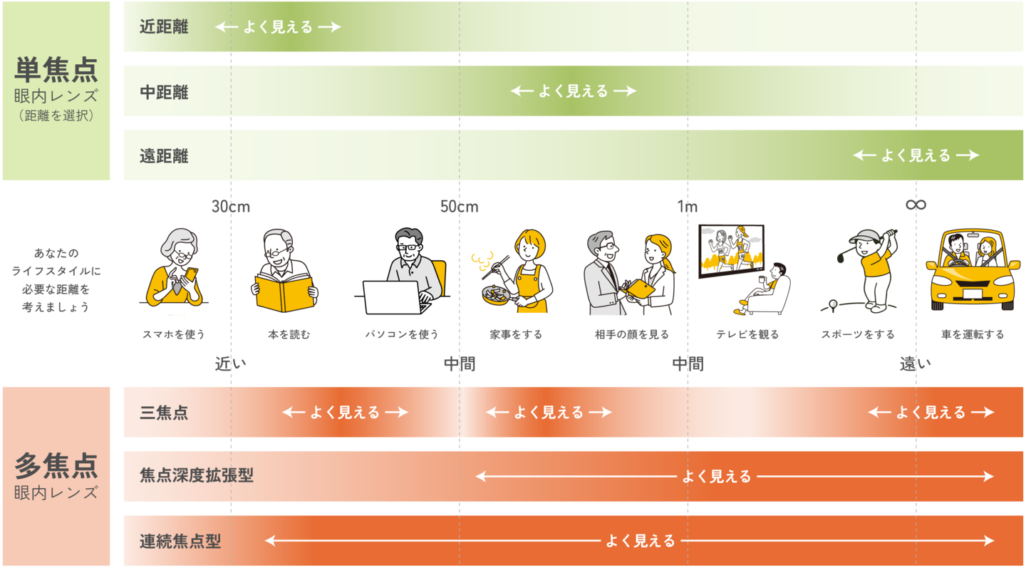 ピントが合う距離が一つなので、生活スタイルに合わせて、手元から遠くの1点でピントの位置を選んでいただきます。